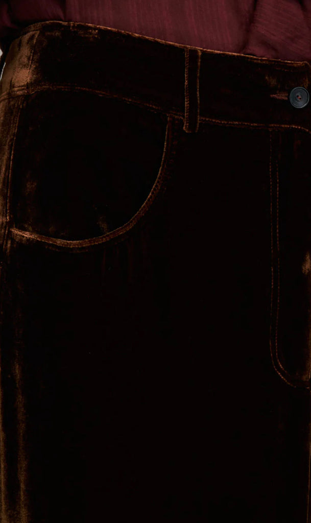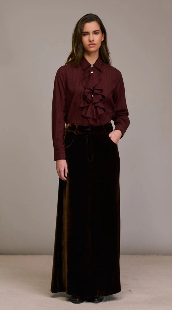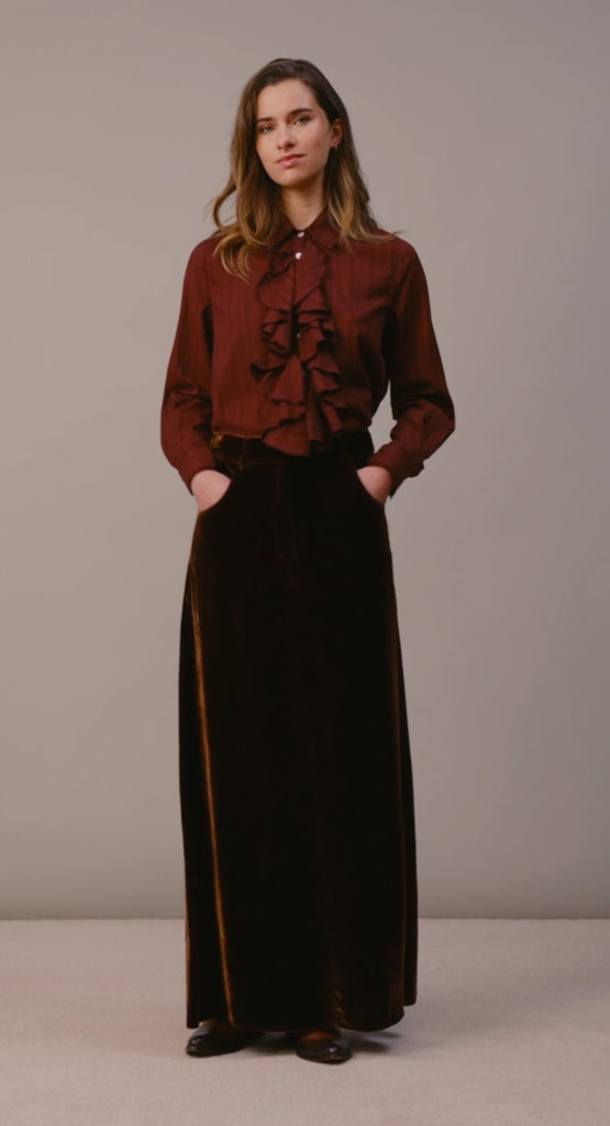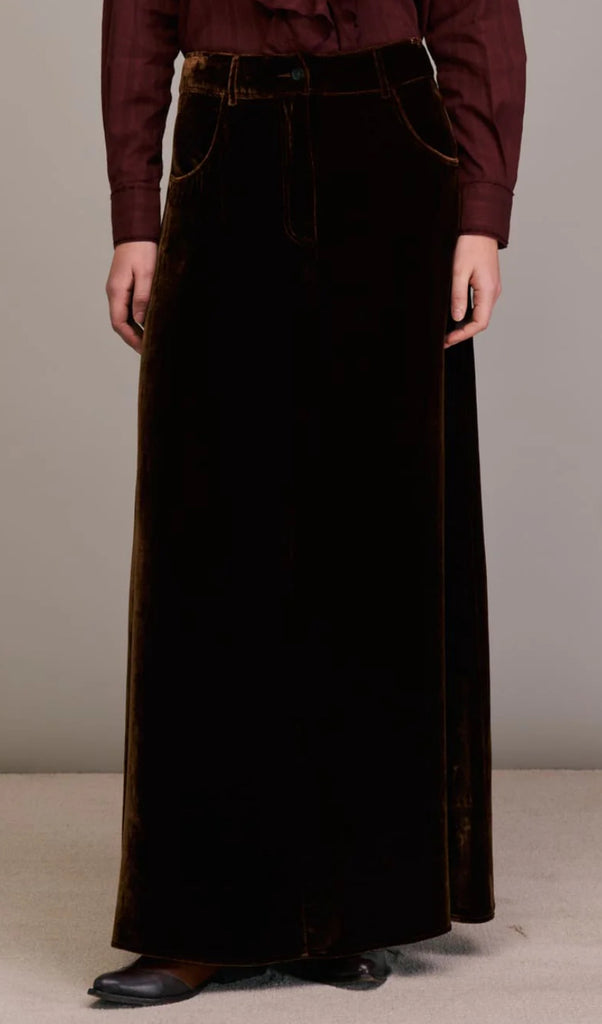 Gonna lunga in velluto di seta marrone.
