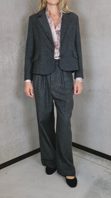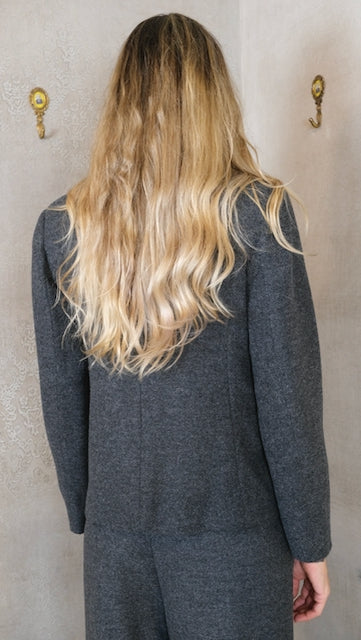 Giacca corta spinata con doppio rever a sinistra.